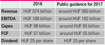 - EBITDA declined by 16.5%year-on-year to HUF 38.3 billion in Q1 2017, due to lower gross margin and higher indirect costs, as well as an unusually high Q1 2016 comparison figure, supported by one-off items.