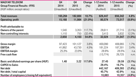 - Profit attributable to the owners of the parent company (net income) more than doubled from HUF 1.5 billion to HUF 3.4 billion in the fourth quarter of 2015, primarily driven by this significant drop in income tax expenses and to a lesser degree, lower profits attributable to non-controlling interests on account of a fall in profits at both Makedonski Telekom and Crnogorski Telekom. However,over the full year, despite lower income taxes, profit attributable to the owners of the parent company decreased by 3.1% reflecting the 8.8% fall in operating profitand a higher share of profits attributable to non-controlling interests.