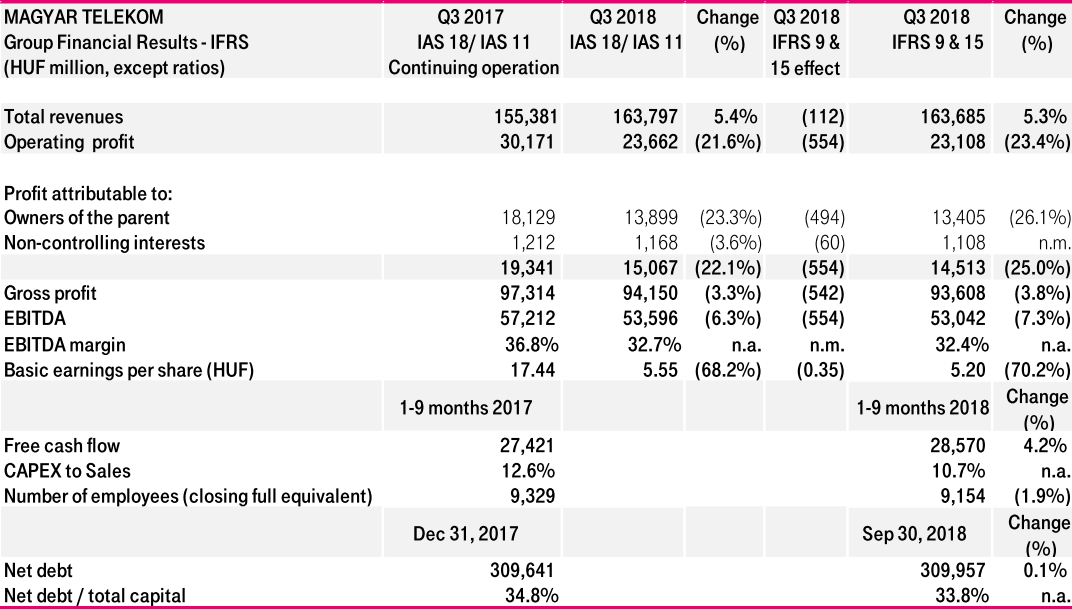 In addition to figures prepared in accordance with IFRS, Magyar Telekom also presents non-GAAP financial performance measures, including, among others, EBITDA, EBITDA margin and net debt. These non-GAAP measures should be considered in addition to, but not as a substitute for, the information prepared in accordance with IFRS. Non-GAAP financial performance measures are not subject to IFRS or any other generally accepted accounting principles. Other companies may define these terms in different ways. For further information relevant to the interpretation of these terms, please refer to the chapter “Reconciliation of pro forma figures”, which is posted on Magyar Telekom’s Investor Relations webpage at www.telekom.hu/investor_relations.
