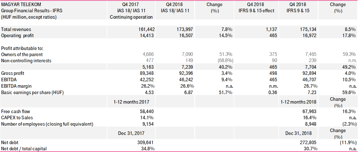 “The Group has maintained strong earnings momentum throughout 2018, delivering revenue growth of 7.6% for the year. We outperformed our guidance, for both revenues, which reached HUF 657.1 billion, and EBITDA, which amounted to HUF 192.5 billion. The factors behind the EBITDA growth were the higher gross profit and one-off profit realized by the sale of real estates. We also exceeded our free cash flow target, which reached HUF 68 billion in 2018 thanks to a higher EBITDA, declining acquisition costs and the one-off income from the real-estate sales, while CAPEX stood at HUF 91.8 billion. Furthermore, through our continuous focus on our core business and meeting customer needs, and by constantly refreshing our product offering, we regained or maintained our leading position in all key market segments, including post-paid mobile, TV and fixed broadband.