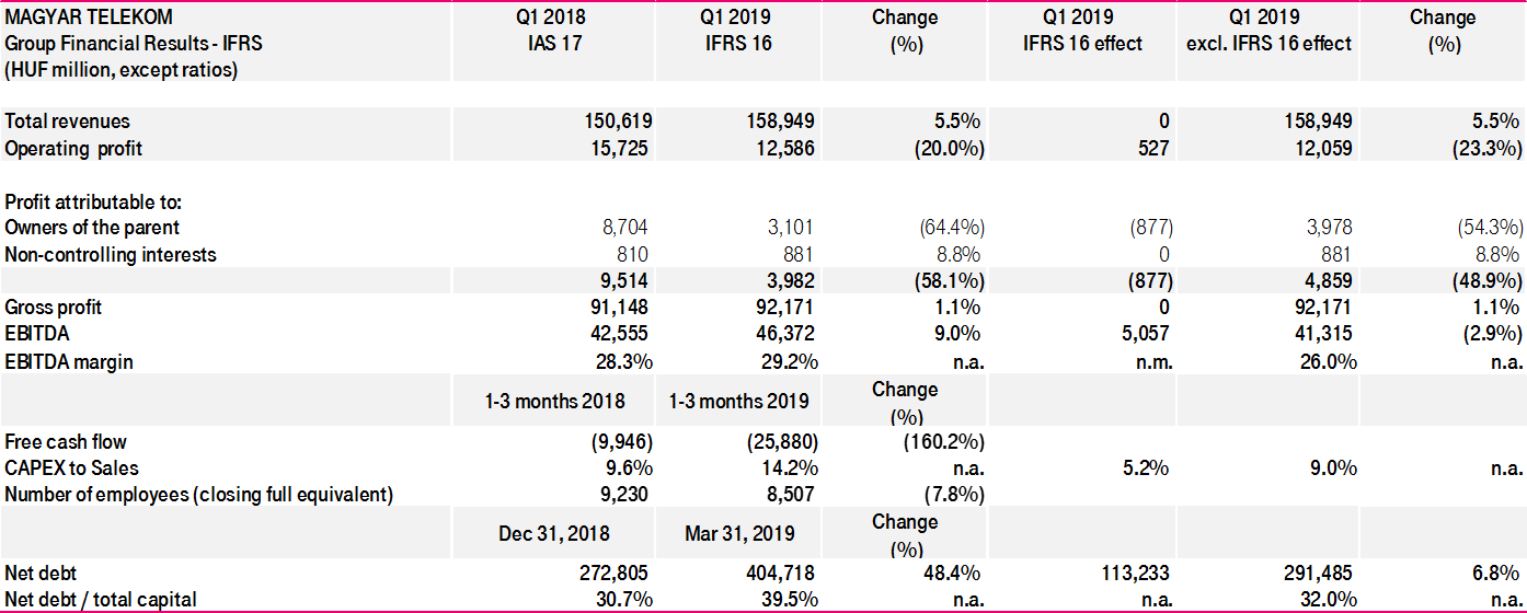“I am pleased to confirm that Magyar Telekom has maintained its momentum from 2018 to deliver both revenue and EBITDA growth in Q1 2019. We increased revenue by 5.5% to HUF 158.9 billion through strong performance of data driven services in both the fixed and the mobile segments and by continuing to grow equipment sales. While we recorded 9% growth in EBITDA, this was attributable to IFRS16 implementation, without which a slight decline was registered on the account of severance expenses incurred in Hungary. On Free Cash Flow we experienced a stronger than usual Q1 decline in our figures, but with the planned sale of real-estate in 2019, we remain confident that we will meet our guidance for 2019.