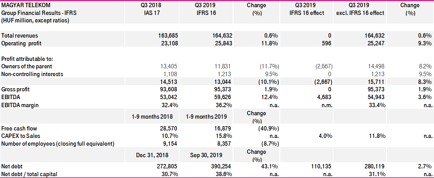 - Net debt increased to HUF 390.3 billion at the end of Q3 2019, reflecting the recognition of lease liabilities in accordance with IFRS 16 and the payment of dividends in May 2019