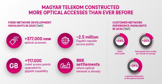- Magyar Telekom continued to intensively develop its gigabit network in 2020: the company constructed 377 thousand new optical accesses and upgraded 117 thousand cable access points to gigabit capability. With this, the total number of gigabit accesses increased to almost 2.5 million.