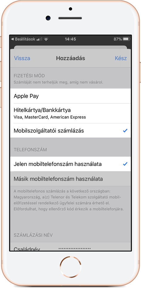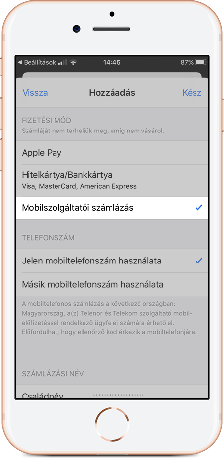 A Fizetési mód hozzáadása pontban válaszd ki a Mobilszolgáltatói számlázást és a Jelen/másik telefonszám használata lehetőséget;