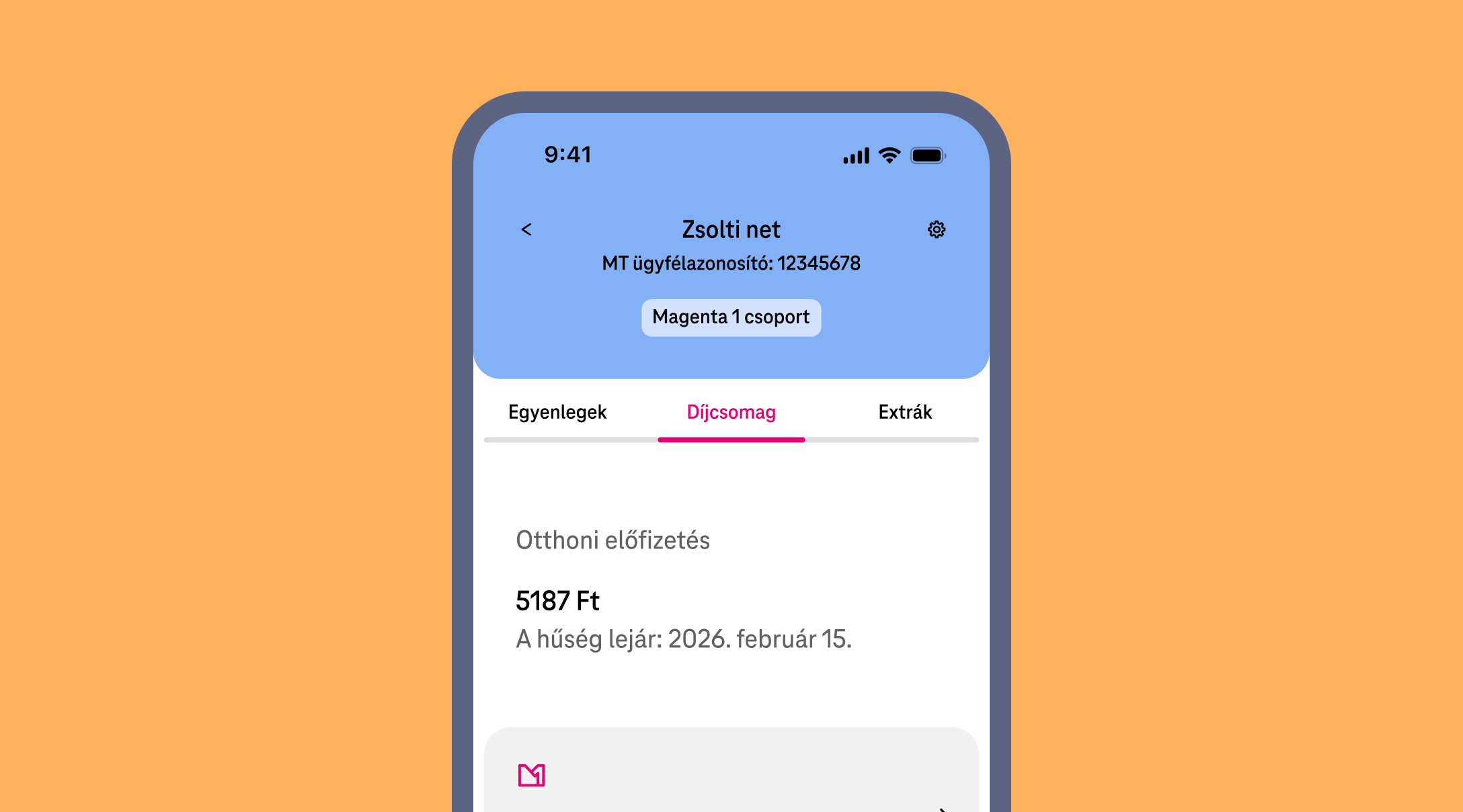 Új tagolást vezettünk be, melynek köszönhetően elkülönítve, 3 fülön látod a mobil, vezetékes internet + telefon és TV előfizetéseidet. Nyomj a fül elnevezésére, vagy húzz balra a fülek közötti váltáshoz.