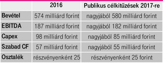 Az év hátralévő részére előretekintve arra számítunk, hogy bár a mobil és a vezetékes szegmensekben indított különböző kezdeményezéseink továbbra is segítik majd eredményeink javulását, ugyanakkor Magyarországon és Macedóniában egyaránt erősödni fog a verseny. Ebből következően 2017 teljes évre vonatkozó publikus célkitűzéseink változatlanul maradnak.”