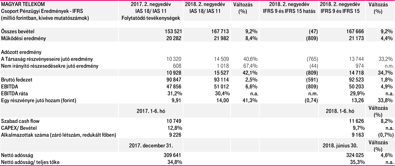 A Nemzetközi Pénzügyi Beszámolási Standardokkal (IFRS) összhangban készített kimutatások mellett a Magyar Telekom nem-GAAP pénzügyi teljesítménymutatókat is közzétesz, többek között EBITDA, EBITDA ráta és nettó adósság mutatókat. Ezek a nem-GAAP mutatók kiegészítik, nem pedig helyettesítik az IFRS szerint közzétett információkat. A nem-GAAP pénzügyi teljesítménymutatók nem azonosak sem az IFRS, sem más, általánosan elfogadott számviteli elvek szerint készített mutatókkal. Előfordulhat, hogy más társaságok ezeket a fogalmakat más módszertan szerint határozzák meg. A fogalmak értelmezéséhez további részletes információ található a pro forma számok összeegyeztetése oldalon, amely megtalálható a Magyar Telekom Befektetői Kapcsolatok honlapján: www.telekom.hu/befektetoknek.