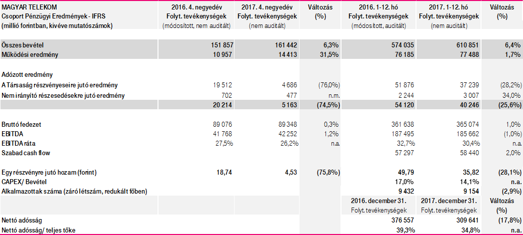 A Magyar Telekom (Reuters: MTEL.BU és Bloomberg: MTELEKOM HB), Magyarország vezető távközlési szolgáltatója ma közzétette 2017. negyedik negyedévre és egész évre vonatkozó Nemzetközi Pénzügyi Jelentési Szabványok (IFRS) szerinti konszolidált pénzügyi eredményeit.