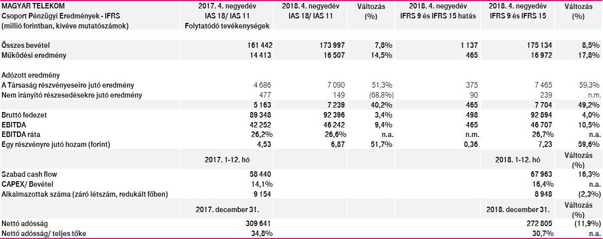 „Örömmel tölt el, hogy a 2018-as év folyamán is megőriztük azt a jó teljesítményt, ami az egész évre vetítve 7,6% bevételnövekedést eredményezett. Túlteljesítettük az előirányzatot mind a bevétel terén, amely elérte a 657,1 milliárd forintot, mind pedig az EBITDA vonatkozásában, amelynek összege 192,5 milliárd forintot tett ki a magasabb bruttó fedezetnek, valamint az ingatlanértékesítéséből származó egyszeri bevételeknek köszönhetően. Az éves szabad cash-flow célunkat is túlteljesítettük, mivel 68 milliárd forinttal zártuk az évet, ami elsősorban a magasabb EBITDA-nak, illetve a csökkenő akvizíciós költségeknek és az ingatlanértékesítésből származó egyszeri bevételeknek volt köszönhető, míg a CAPEX költésünk 91.8 milliárd forintot ért el. Ezen túlmenően az alaptevékenységünkre és az ügyfelek igényeinek kielégítésére fordított erőforrásainknak köszönhetően, valamint termékkínálatunk folyamatos frissítésével visszaszereztük vagy megtartottuk vezető pozíciónkat valamennyi kulcsfontosságú piaci szegmensben, ideértve az előfizetéses mobil, TV és vezetékes szélessávú internet szegmenseket is.