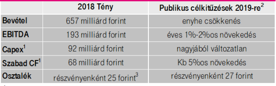2019-re kitekintve a bevételeink kis mértékű csökkenésére számítunk, míg az összehasonlítható alapon számított EBITDA 1%-2%-os emelkedését várjuk a közvetett költségeink csökkentésének köszönhetően. A CAPEX költésünket az ideivel azonos szinten tervezzük tartani (nem számítva az IFRS16 hatást és a spektrum költségeket) összehangban a vezetékes hálózatunk folyamatos fejlesztésével, amely magába foglalja az optikai hálózatbővítési programunk felgyorsítását. A jövedelmezőségünkben tapasztalt trendfordulónak köszönhetően arra számítunk, hogy szabad cash-flownk (a spektrum licenszdíjak nélkül) 5%-kal növekedhet. A jelenlegi és várható működési és szabályozási környezet alapján arra számítunk, hogy a Társaság részvényenként 27 forint osztalékot fog fizetni a 2019. évi eredmények után. A hivatalos osztalékjavaslatot az Igazgatóság megfelelő időben fogja előterjeszteni a Közgyűlés részére, amikor az összes szükséges információ rendelkezésre áll, és valamennyi előfeltétel teljesül.”