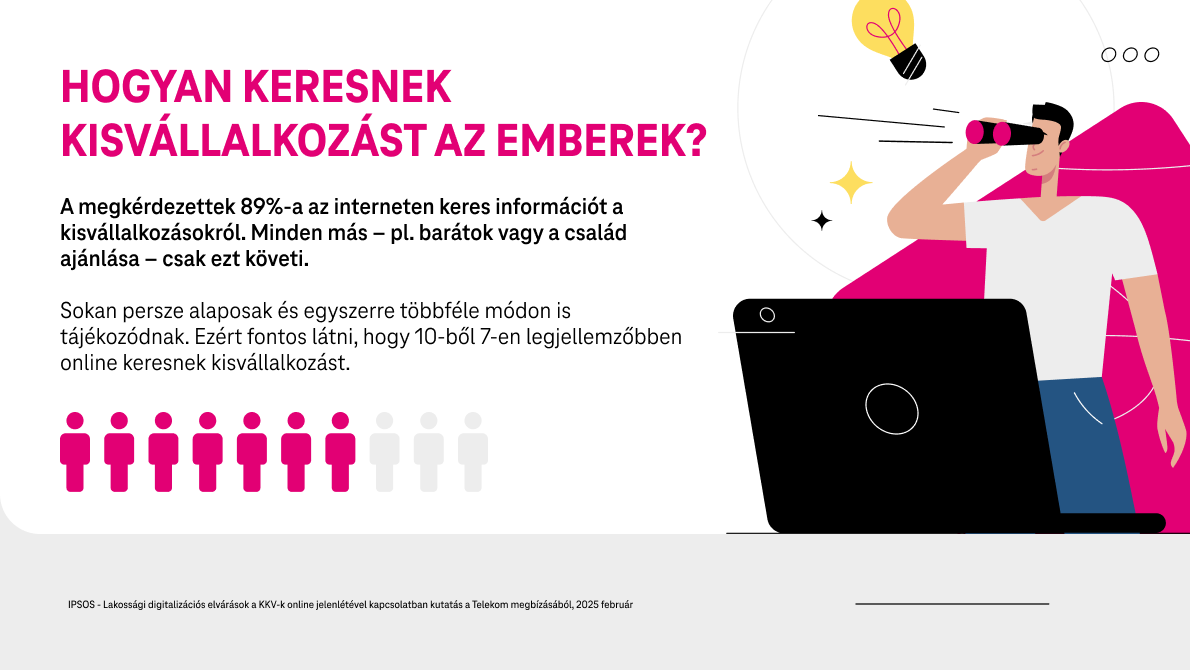 Ezzel a többségi vállalkozói attitűddel ellentétes képet mutat be a Telekom megbízásából készült friss Ipsos kutatás eredménye. A Telekom korábbi, 2020-as kutatása 3 óta eltelt fél évtized alatt gyökeresen átalakult, hogy hogyan keresünk szakembert, üzletet, kisvállalkozást. Öt éve még döntően (61%-os aránnyal) a családtagok-barátok ajánlásai alapján döntöttünk, mára 89%-os említéssel az internet került az első helyre, rokonaink és az ismerőseink már csak a második legfontosabb tájékozódási pontnak számítanak, a harmadik hely pedig a közösségi médiáé. Azaz, bár a legtöbben többféle csatornán is keresnek kisvállalkozást, 10-ből 7-en a legjellemzőbb módon ma már az interneten teszik ezt.