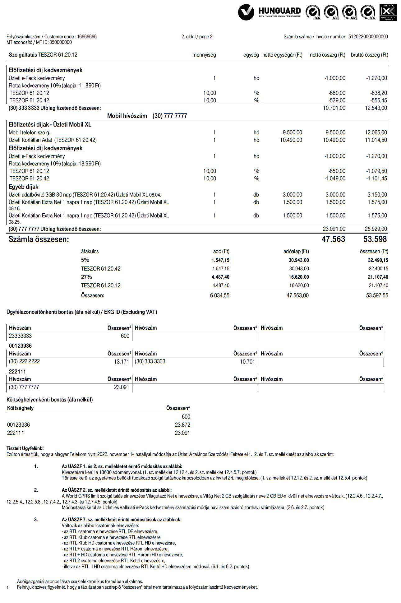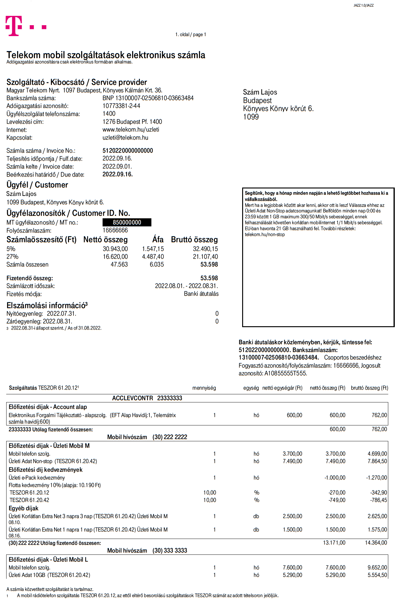 Az üzleti mobil szolgáltatások számlaképén való könnyebb eligazodás érdekében összeállítottunk egy ismertetőt a számlán szereplő legfontosabb adatokról. Figyelmedbe ajánljuk, hogy számládat már sorban állás nélkül, elektronikusan is befizetheted: csoportos beszedési megbízással vagy banki átutalással bankodból! Az illusztrációként szolgáló számlaképen az árak és a feltüntetett szolgáltatások tájékoztató jellegűek.