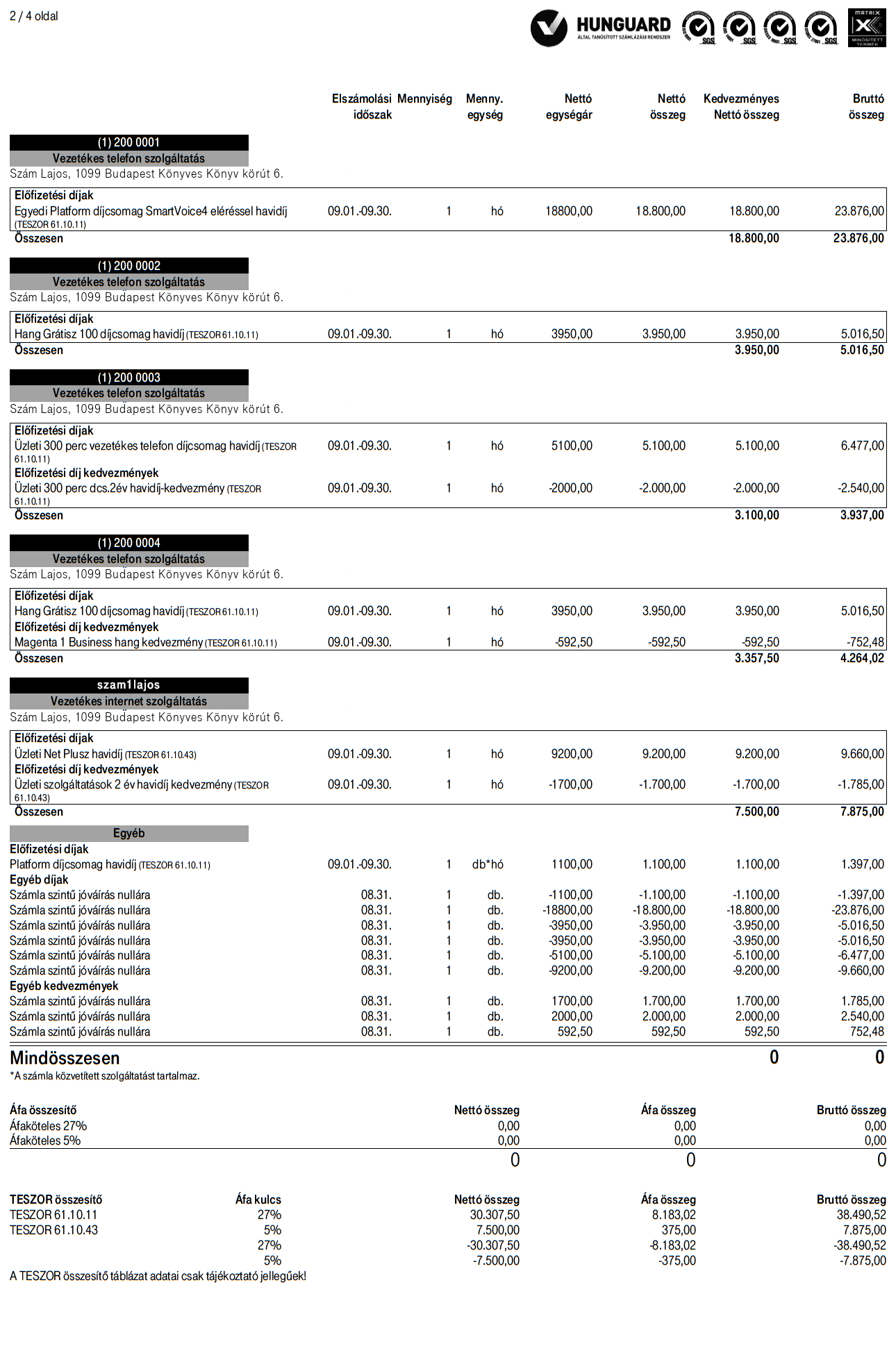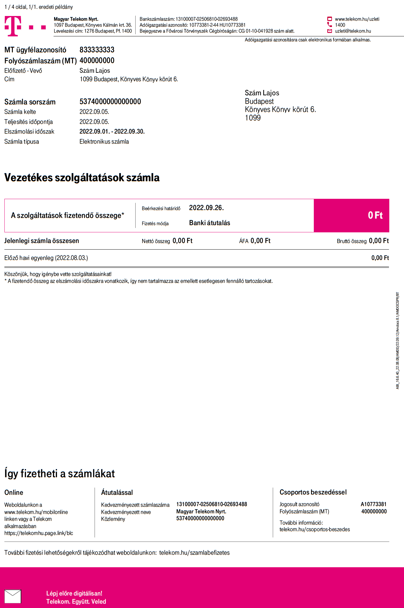 A vezetékes üzleti szolgáltatások számlaképén való könnyebb eligazodás érdekében összeállítottunk egy ismertetőt a számlán szereplő legfontosabb adatokról. Figyelmedbe ajánljuk, hogy számládat már sorban állás nélkül, elektronikusan is befizetheted: csoportos beszedési megbízással vagy banki átutalással bankodból! Az illusztrációként szolgáló számlaképen az árak és a feltüntetett szolgáltatások tájékoztató jellegűek.